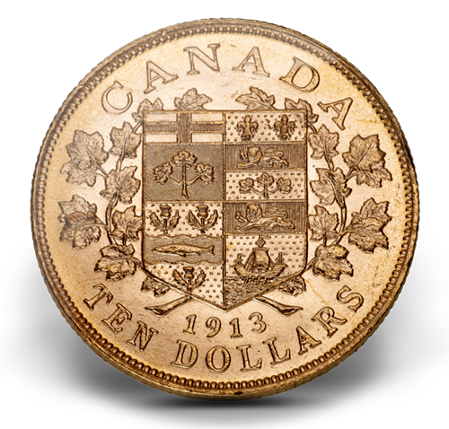 Le motif du revers représente les armoiries du Canadade l’époque, un écu constitué des emblèmes héraldiques des provinces du Dominion du Canada : l’Ontario,le Québec, la Nouvelle-Écosse et le Nouveau-Brunswick. L’écu est encerclé de magnifiques rameaux d’érable. Au-dessus est gravée l’inscription « CANADA », et au dessous figurent le millésime « 1913 » et la valeur nominale «TEN DOLLARS », en anglais. L’avers dela pièce est à l’effigie du roi George V. Un grènetis souligne le pourtour des deux côtés de la pièce.
