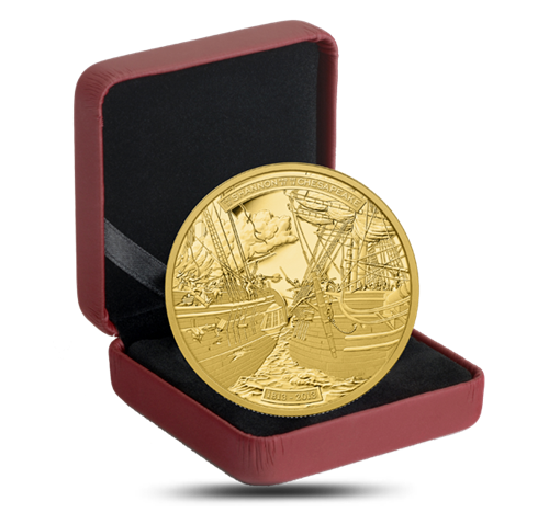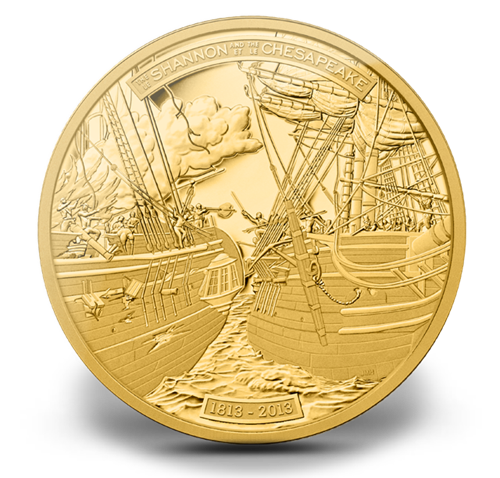 • Cette pièce de 5 onces en or pur commémore le bicentenaire de la défaite historique infligée au USS Chesapeake par le HMSShannon durant la guerre de 1812.