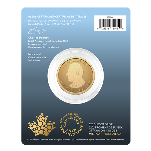 - Comprend un certificat de titrage. Signé par notre essayeur en chef, le certificat de titrage imprimé au dos de la carte garantit l’authenticité et la pureté (or pur à 99,999 %) de votre pièce d’investissement haut de gamme en or.