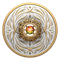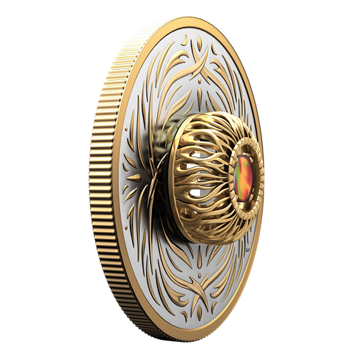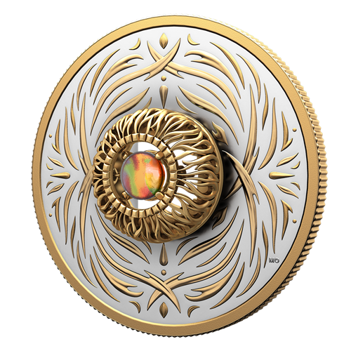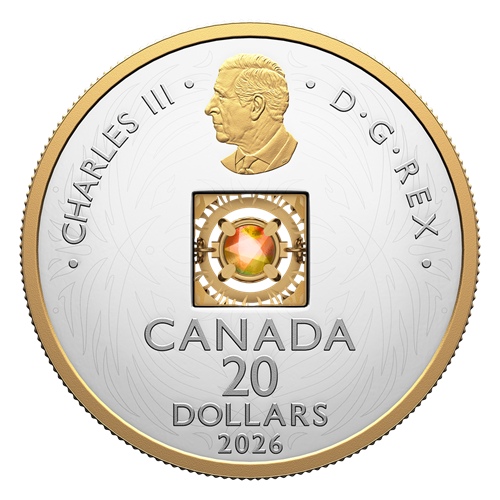 Rehaussé d’un placage d’or sélectif, le motif au revers, œuvre de l’artiste canadienne Mariya Olshevska, présente des gravures abstraites inspirées par l’aspect rythmique du Feu. Comme les flammes vacillantes d’un feu de joie, les lignes incurvées dansent autour de l’ammolite ronde de 5 mm placée au centre du motif. La gemme organique, qui a été extraite de manière responsable de la formation géologique de Bearpaw, en Alberta, est sertie dans une monture 3D conçue par le fabricant de bijoux canadien Beverly Hills Jewellers. La monture rehaussée d’un placage d’or permet à la gemme suspendue de « danser » au moindre mouvement de la pièce. À l’avers, où figure une version stylisée du motif gravé au revers, l’effigie de Sa Majesté le roi Charles III, selon l’artiste canadien Steven Rosati, est aussi rehaussée d’un placage d’or.