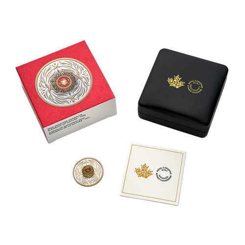 La pièce est encapsulée et présentée dans un boîtier à double coque noir orné du logo de la Monnaie royale canadienne. Le boîtier est assorti d’une boîte protectrice rouge montrant une image de la pièce.