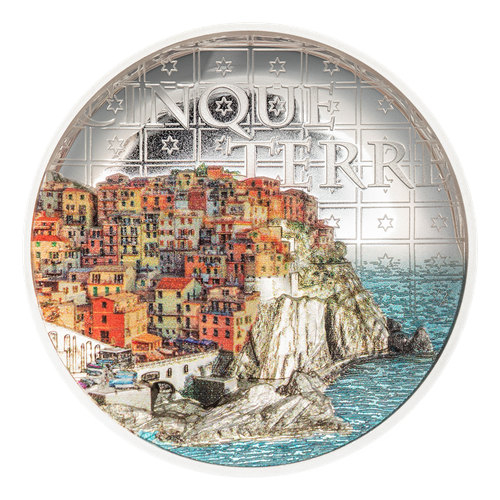 - Des touches de couleur rehaussent les maisons multicolores des villages emblématiques de Cinque Terre, la côte rocheuse et les flots bleus et miroitants de la Méditerranée, le fini épreuve numismatique se mêlant harmonieusement à la gravure rehaussant les rochers.