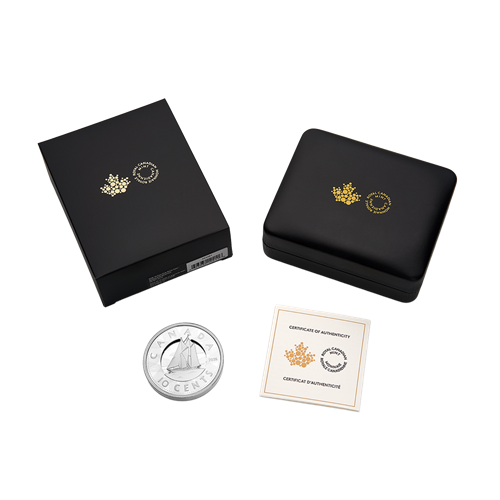 La pièce est encapsulée et présentée dans un boîtier à double coque noir orné du logo de la Monnaie royale canadienne. Le boîtier est assorti d’une boîte protectrice noire.
