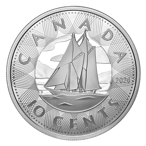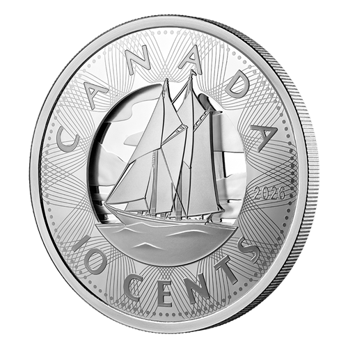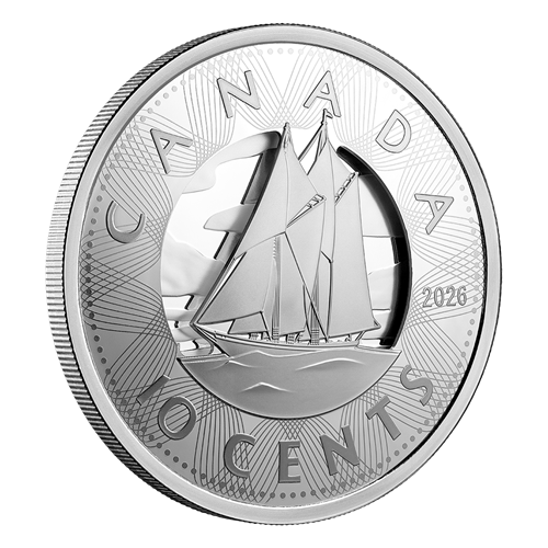 Sur la couche supérieure du revers de cette réinterprétation artistique à relief multiple de la pièce de circulation de 10 cents canadienne sont gravées les inscriptions « CANADA », « 10 CENTS » et « 2026 ». Le revers comporte également une découpe qui révèle un ciel nuageux gravé sur la surface intérieure et une représentation de l’emblématique Bluenose d’Emanuel Hahn, semblant flotter au-dessus. Des motifs curvilignes de 10 lignes entrelacées symbolisant la valeur nominale rehaussent la couche supérieure du revers et le champ de l’avers, lequel est à l’effigie de Sa Majesté le roi Charles III, selon l’artiste canadien Steven Rosati.