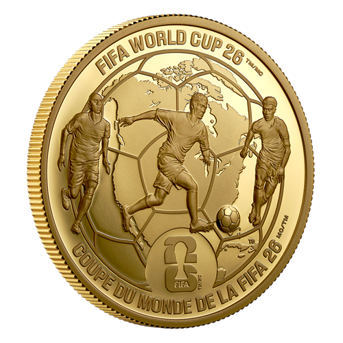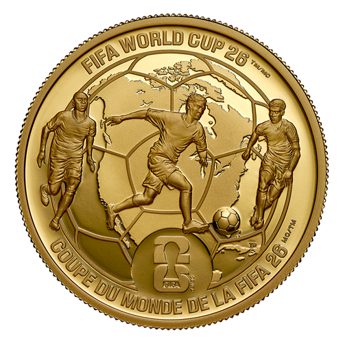 Cette pièce de 1 oz en or pur à 99,99 % met à l’honneur le Canada, le Mexique et les États-Unis, les trois pays hôtes de la Coupe du Monde de la FIFAMC/TM, une première dans l’histoire du tournoi. Le motif au revers présente une carte de l’Amérique du Nord superposée à un motif classique de ballon de football (ou de soccer), l’entourant comme un globe pour accueillir le monde au championnat. Trois joueurs y sont représentés en plein mouvement, symbolisant la passion qui unit les amateurs et les joueurs sur le terrain, dans les gradins et à travers le monde.